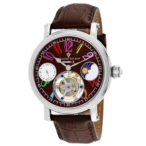Stainless steel case, Leather Strap, Brown dial, Tourbillion movement, Scratch resistant mineral, Water resistant up to 3 ATM - 30 meters - 100 feet