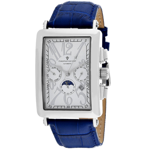 Stainless steel case, Leather strap, Blue dial, Automatic movement, Scratch resistant mineral, Water resistant up to 5 ATM - 50 meters - 165 feet